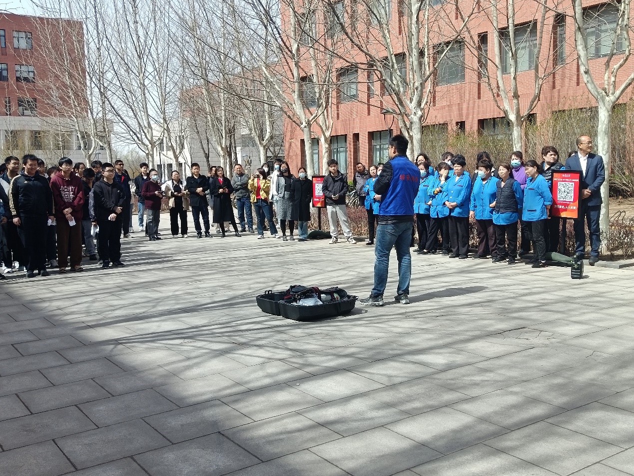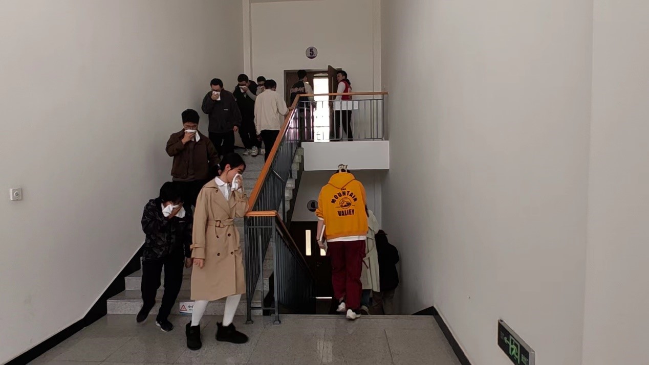 演练分为楼内疏散、现场讲解两个部分。12:30演练正式开始。火警警报发出后,理科组团各公司师生及第三方服务人员沿安全出口标识指向,按照就近原则选择合适的楼梯通道低势、快速、安全有序地疏散到楼外指定地点。不同楼宇的演练小组分组进行演练。保卫处、实验室设备处老师现场讲解疏散逃生要领以及防火面罩使用等消防应急知识。
