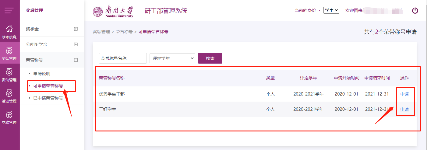 本年度荣誉称号和奖学金申请流程相互独立,员工不需要提交个人信息也可以申请荣誉称号。9月9日起,请员工在奖惩管理模块下的荣誉称号菜单,可点击选择可申请的荣誉称号,选择相应的荣誉称号进行填写提交,提交后可下载打印个人申请表。