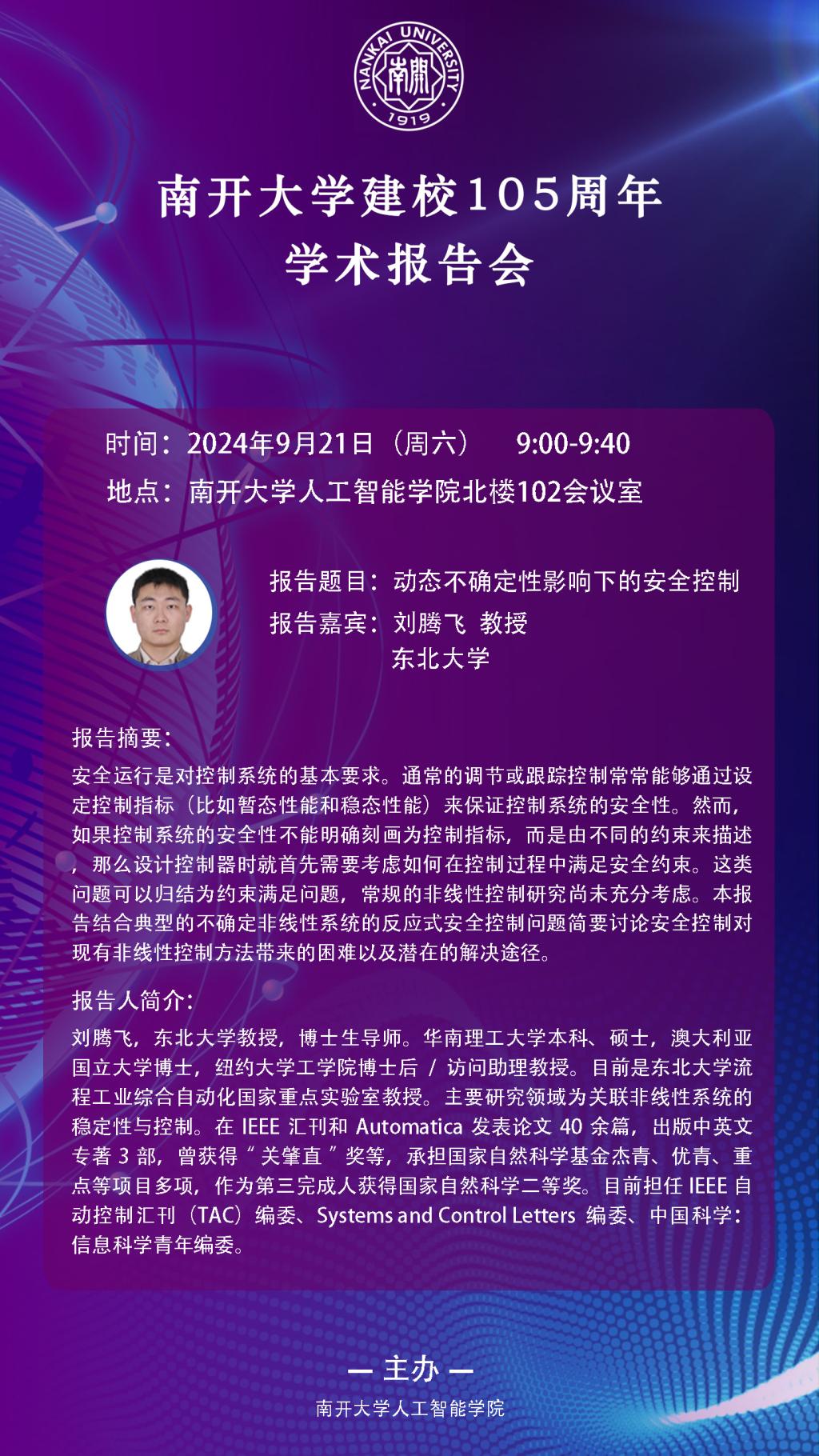 报告1:动态不确定性影响下的安全控制 报告人:刘腾飞 教授(东北大学) |