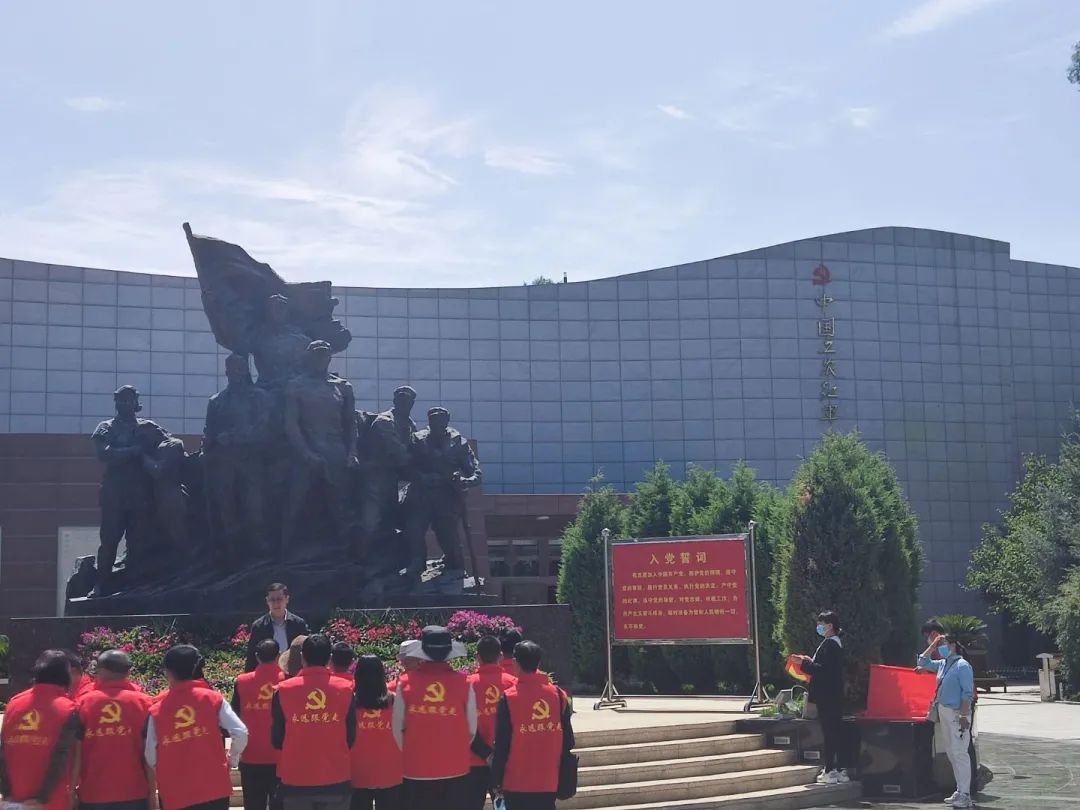在中国工农红军西路军革命烈士纪念碑前,全体队员整齐列队、庄严肃立,怀着崇敬的心情向西路军纪念碑致敬,集体鞠躬默哀表达对先烈深深的哀思和崇高的敬意。恰逢那时有重走革命路的机关单位共同参观。“我志愿加入中国共产党,拥护党的纲领……”全体党员面向鲜艳的中国共产党党旗,举起右手庄严宣誓,铿锵有力的宣誓声回荡在纪念馆上空。