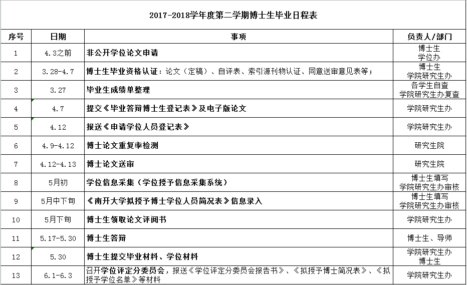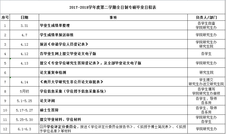 2017-2018学年度第二学期全日制研究生毕业日程表